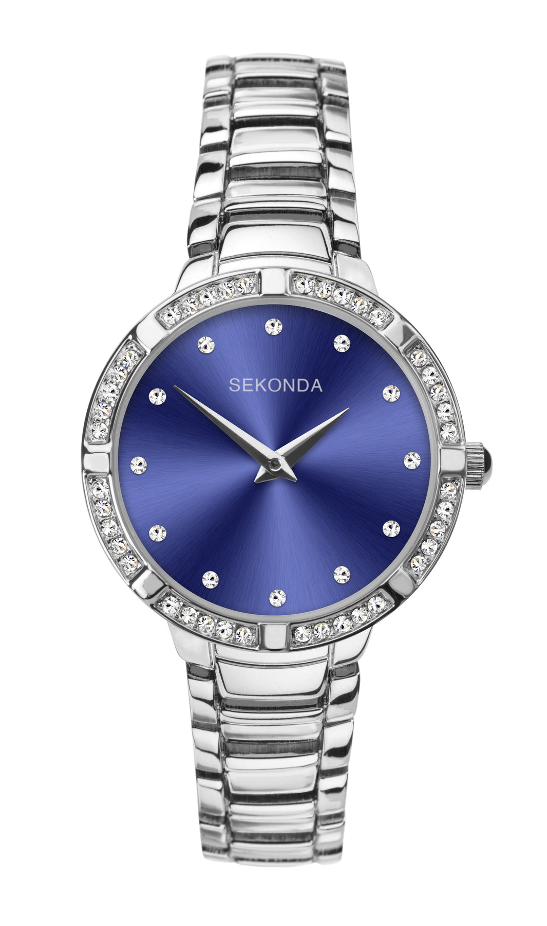 Regular price £59.99This striking women’s watch is perfect for adding a touch of colour to your daily style. The timepiece features a round ionic plated silver coloured stone set case housing a dark blue stone set sunray dial. The watch is fastened with an ionic plated silver coloured bracelet for an elegant finish.